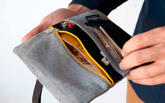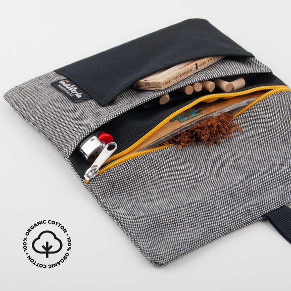 Introduce el paquete de tabaco abierto en el bolsillo con cremallera para acceder fácilmente a él y mantenerlo fresco más tiempo. Además podrás guardar filtros, papel y mechero gracias a sus 3 compartimentos extra.