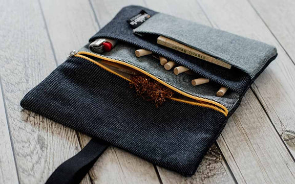 Denim pouch for rolling tobacco and accessories (Yellow Zipper)