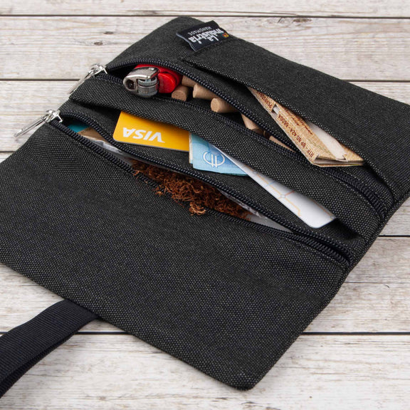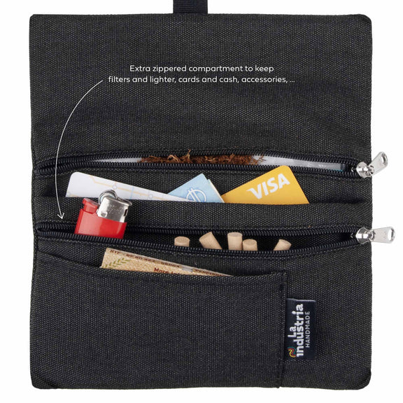 It features 2 zippered compartments and 2 smaller compartments for smoking accessories like filter tips, rolling papers, and your lighter, keeping them together yet organized individually.