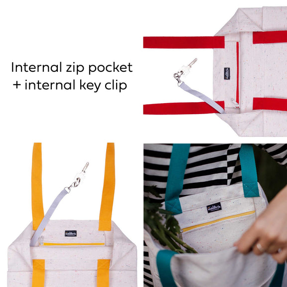 Speckled white fabric coupled with a range of coloured handles affords a modern, minimalist look that’s easy to pair with any outfit. The robust fabric is enhanced with a stain- and water-repellent finish, meaning it’s prepared for some serious use, and set to stand the test of time.